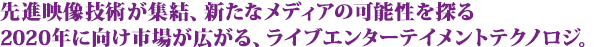 新展開が期待されるVR(仮想現実)、AR(拡張現実)、ホログラム等の新しい映像表現技術や、映像・音響・照明・パフォーマンスを融合したライブエンターテインメント技術などの新しい体験を提供する「コンテンツテクノロジー」を集め、新たなメディアの可能性をプレゼンテーションと展示で次世代そして未来へ発信します。