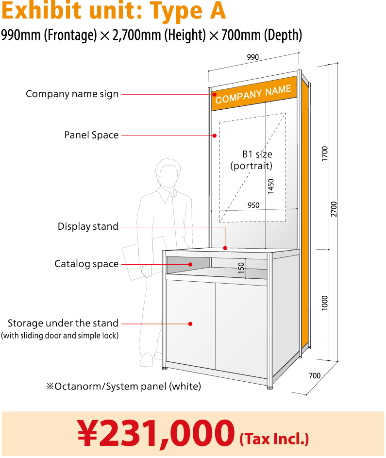 Display unit counter: Basic display stand, display back wall, company name sign, electricity supply construction fee/electricity usage (1kW), 2 outlets, shared Internet connection.