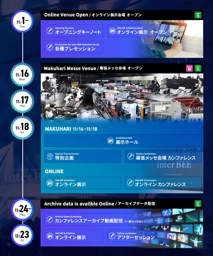 Inter BEE 2022 イベント開催の流れ オンラインイベント及び幕張メッセで開催されるリアルイベントともに、 公式Websiteより来場登録 の上ご参加ください。 画像クリックで拡大表示されます。