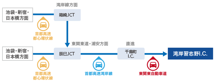 湾岸習志野I.C.(東関東自動車道)、または幕張I.C.(京葉道路)から約5分。
