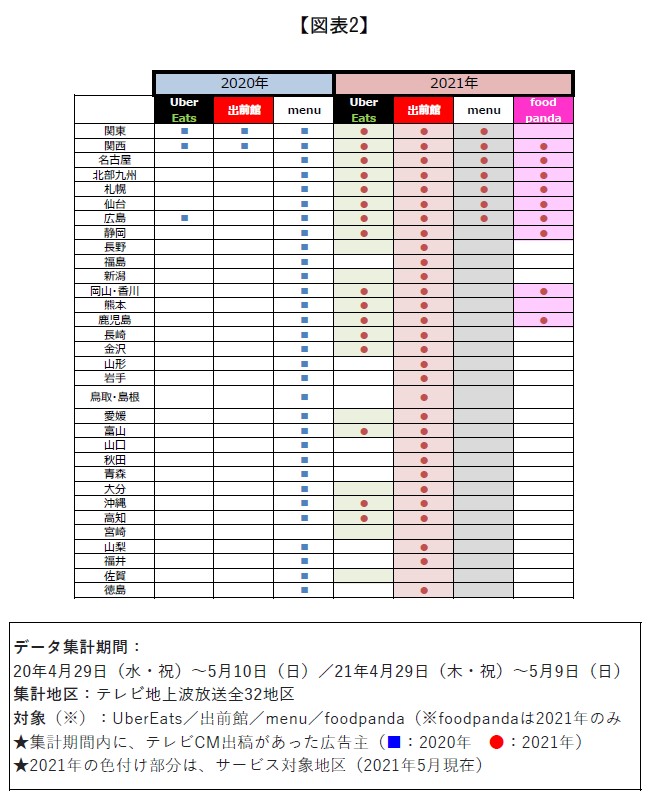 ※INTER BEE CURATIONは様々なメディアとの提携により、Inter BEEボードメンバーが注目すべき記事をセレクトして転載するものです。本記事は、ビデオリサーチ社の協力によりデータ分析から得られた知見を発信する「VRダイジェストプラス」から転載しています。コロナ禍で活性化したフードデリバリー市場の様相を、各社のテレビCM出稿から読み取く内容。出稿量が増えただけでなく、エリアも急速拡大したことがよくわかります。