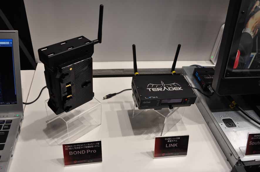 The Bond line of 3G/4G/LTE-compatible live broadcast modules with built-in H.264 encoding was announced at this year's NAB Show and comes in two models, the SDI/HDMI-compatible camera-top Bond II, and SDI-compatible camera-back Bond Pro. It is possible to connect up to six USB modems (3G/4G/LTE) and broadcast full HD video. The original Bond, already on sale, required a Cube encoder, but Sales Manager Yusuke Tanaka explained, "the new model achieves a new level of convenience thanks to the integrated H.264 encoder, which allows you to reduce the number of cables, and the integrated lithium-ion battery." Moreover, with integrated 2.5GHz/5GHz WiFi, "it can also be used as an encoder for transmission to Niconico Video or Ustream," added Tanaka.