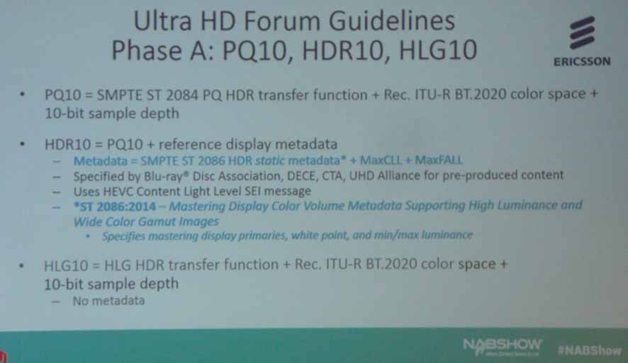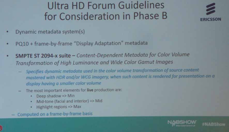 Ericsson's Goldman discussed the activities of the UHD Forum. He also explained in a continuation of PQ10, HDR10, and HLG10 of Phase A of the guidelines presented in the past aspects such as Dynamic metadata system(s), PQ10+frame-by-frame "Display Adaptation" metadata, and SMPTE ST2094×suite were being considered for Phase B.