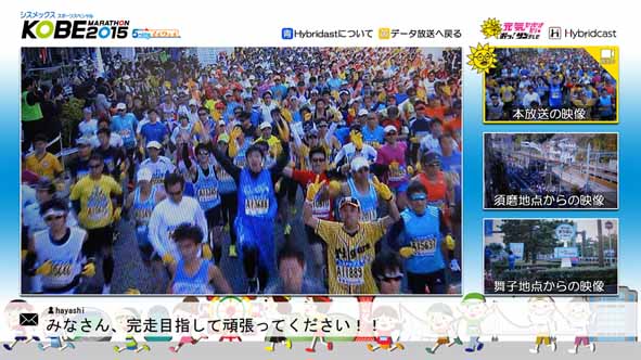 On November 15th, Sun television produced a live program covering the "Fifth Kobe marathon", the full marathon held in Kobe, in which citizens may participate. The program was a "multi-angle, live streaming broadcast experiment" that used Hybridcast. Using their remote controls, viewers were free to control which video to view on their television screen from the live video from cameras set up in multiple locations around the marathon course.