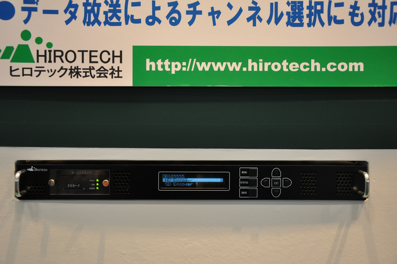 At InterBEE 2011, Hirotech is holding a debut exhibition of the “DBS85555A”, a single-unit in-building independent broadcasting device loaded with four boards, each consisting of an MPEG2/H.264 encoder and modulator. At the booth, there will be a demonstration in which an HDMI signal output from a Blu-ray disc player will be converted into HD-SDI, inputted to this device, encoded as a 1080i full HD image, and outputted to a digital television as an OFDM-converted RF signal.