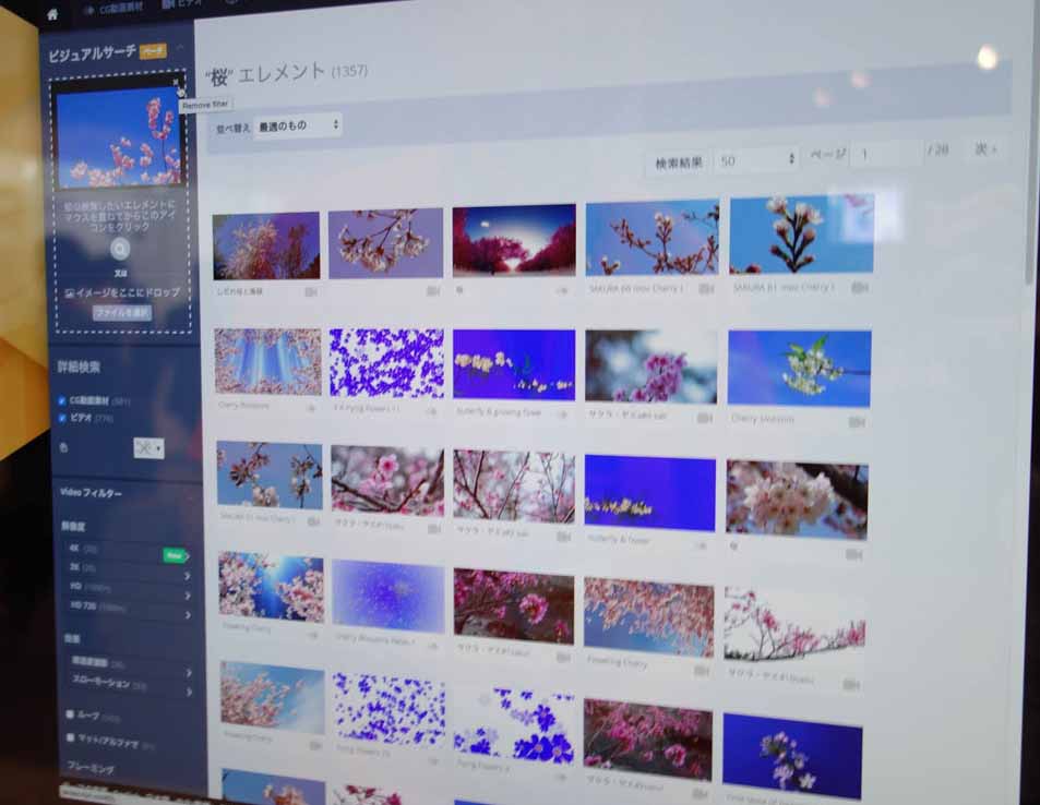 ビジュアルサーチは、静止画をキーとして、その画像のイメージに似た動画コンテンツを検索する機能。例えば、「sakura」で絞り込んだ後に、「青空を背景にした桜」の画像をキーとして読み込ませると、近いイメージの動画コンテンツを検索結果として示す。言語の違いを吸収できるだけでなく、言葉にしにくいイメージを画像で的確に指示し、動画コンテンツを検索できる。