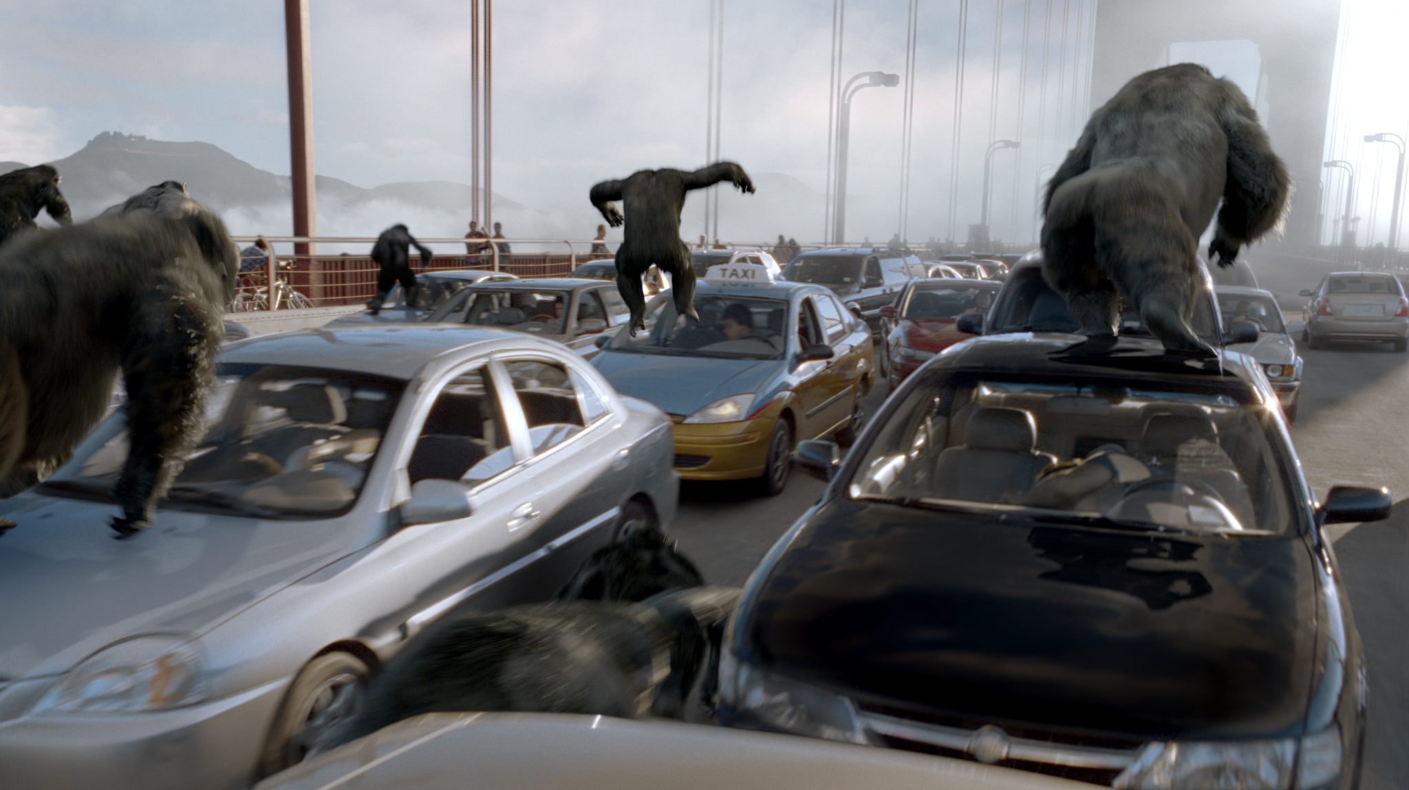 チンパンジー、ゴリラ、オラウータンなどのCGキャラクターの身体の動きは、モーション・キャプチャーで取り込まれた動きとMassiveを活用した群にシステムを併用して作成された(写真4)。今回は身体の動き屋外の環境でキャプチャーする必要があり、そのために、赤外線を放つLEDの配列をコントロール・パックの中に並べたアクティブ・マーカーが使用された。ゴールデン・ゲート・ブリッジのシーケンス(写真5)では、車の間を縫うように激しく走りまわるCGキャラクターの動きをキャプチャーするために、T字形をしたポータブルなカメラ設置デバイスが活用されたそうだ。このシーケンスでは、キャラクターのみならず、橋やその周りの環境、車やヘリコプターなどの乗り物、霧や煙などのエフェクト、さらに破壊シミュレーションや流体シミュレーションなど、実に多くの要素がCGで作成されている。画像の車はすべてCGで作成されており、車体にCGキャラクターの身体が写り込む様子まで丹念に描き出されている。