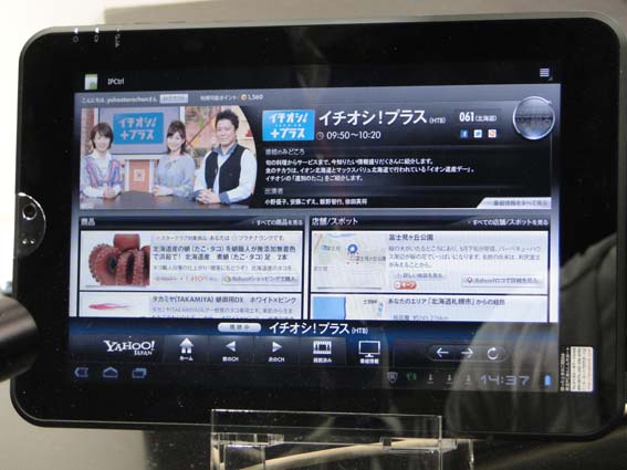 また会場では参考出展として、REGZAで観ている番組の関連情報をYahoo!のサーチエンジンを活用してタブレット端末に表示するサービスを紹介、インターネットとテレビの親和性をアピールしていた。タブレット側のインターフェースには、情報の頭出しとWebへのリンクのほか、テレビセットのリモコン操作もできるようになっている。