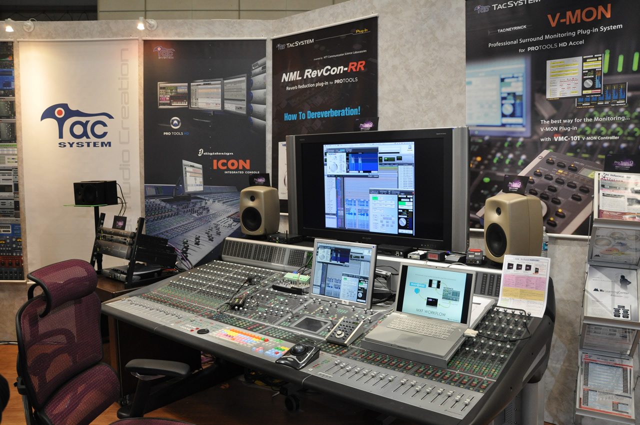 タックシステム(ブース:4208)は、NTTとNTTラーニングシステムズが開発した残響制御技術を使った2ch音源を5.1chサラウンド化するDigidesign社のPro Tools用プラグインソフト「NML RevCon-RS(Real Sorround)」とファイルベースのワークフローを可能とするNEYRINCK社のプラグインソフト「SoundCode Exchange MXF」をデモンストレーションした。